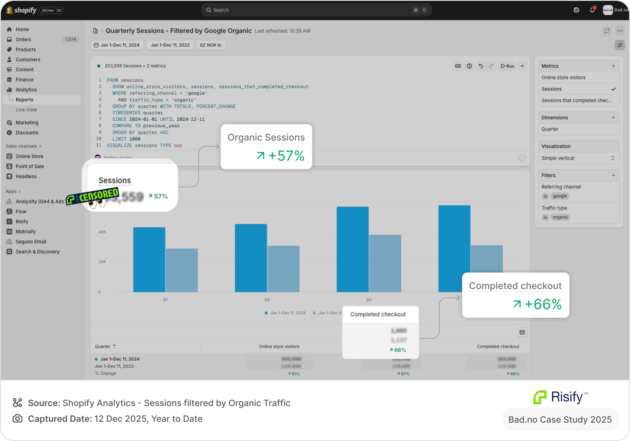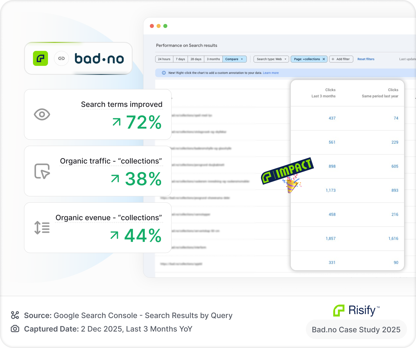 As Bad.no looked to scale organic growth across a 30,000+ product catalog, they partnered with Risify to rebuild their collection structure. What followed was sustained traffic growth, stronger rankings, and measurable revenue impact.