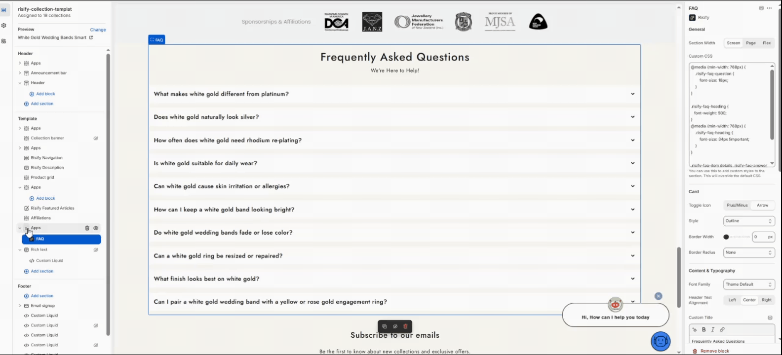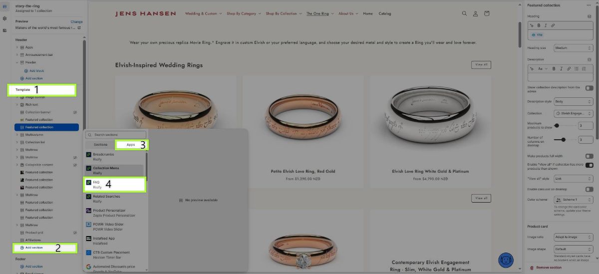 Now that your FAQs are created and assigned inside Shopify Admin, it’s time to display them on your storefront. In this phase, you’ll open your theme, navigate to the correct product or collection page, add the Risify FAQ section, and customize its appearance.