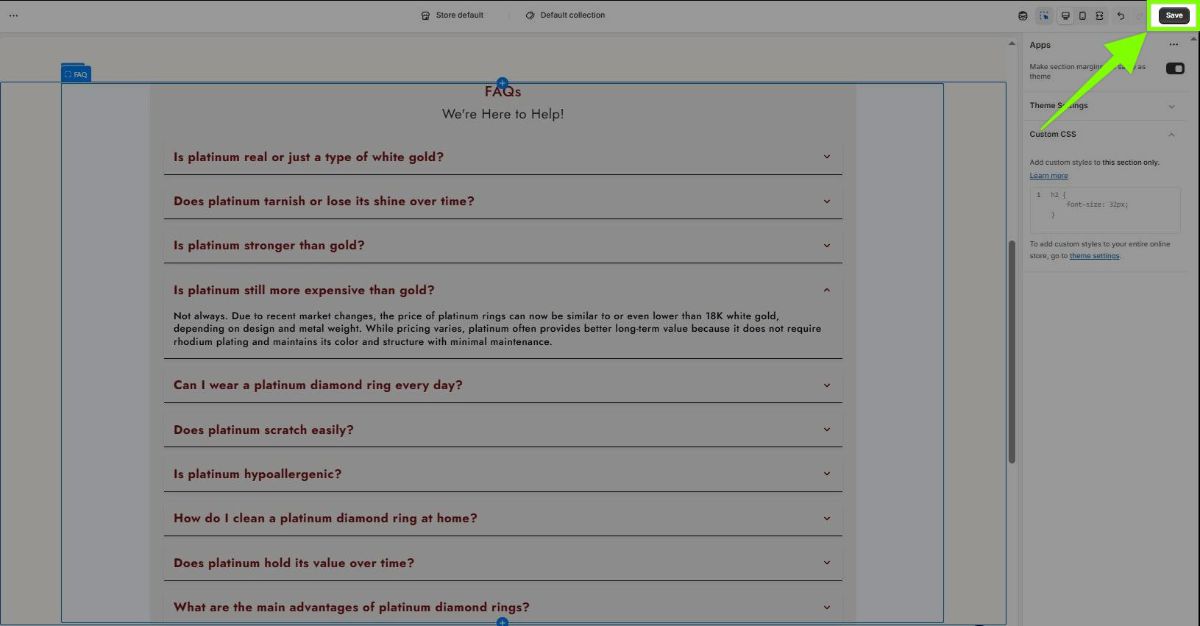 When you’re satisfied with the layout and styling, click Save in the upper-right corner. Your FAQs will now appear on the relevant product or collection pages, styled to match your theme and layout.