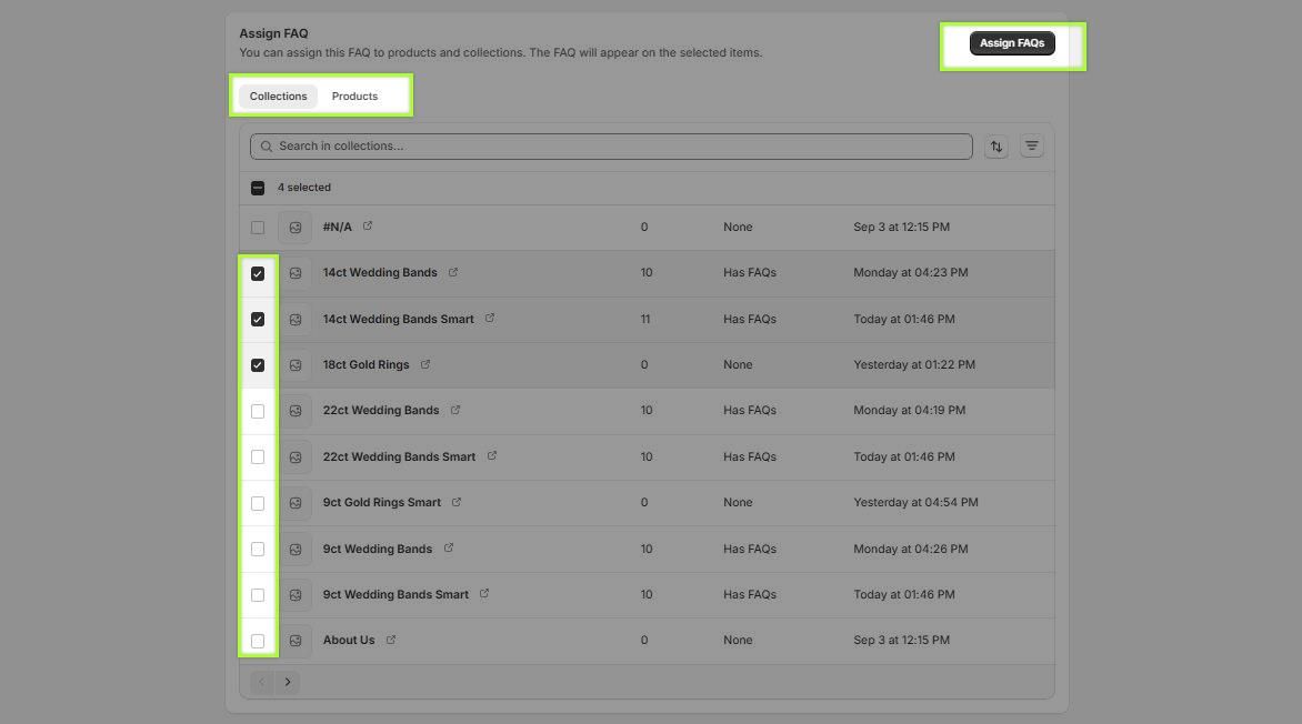 Creating the FAQ isn’t enough - you also need to decide where it will appear. Below each saved FAQ, you’ll see an Assign FAQ section with two tabs: Collections and Products.