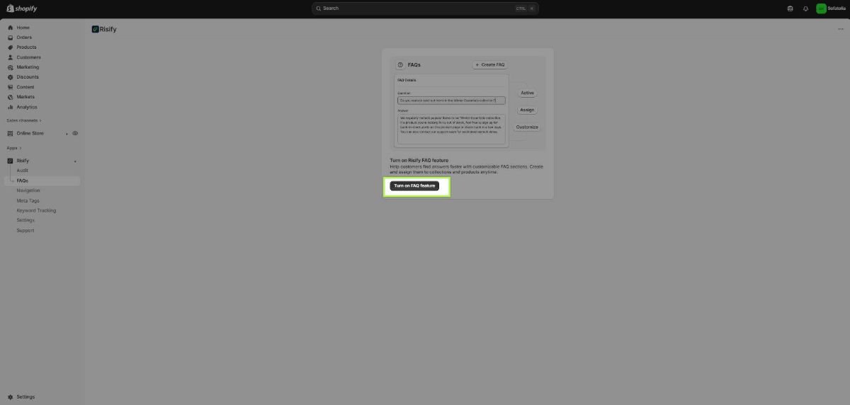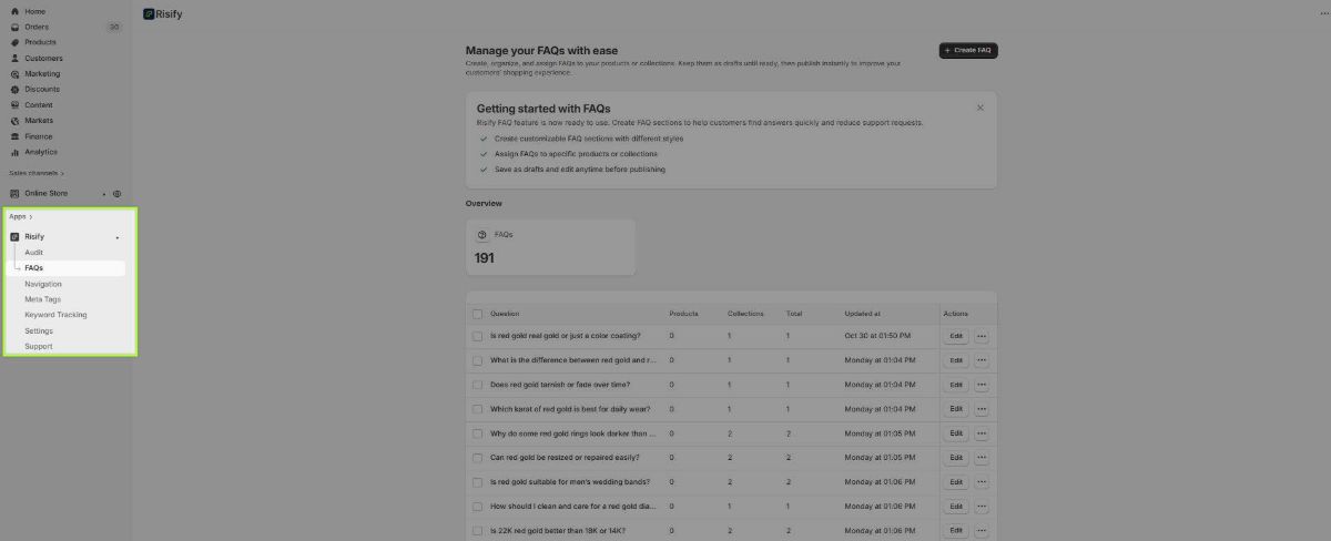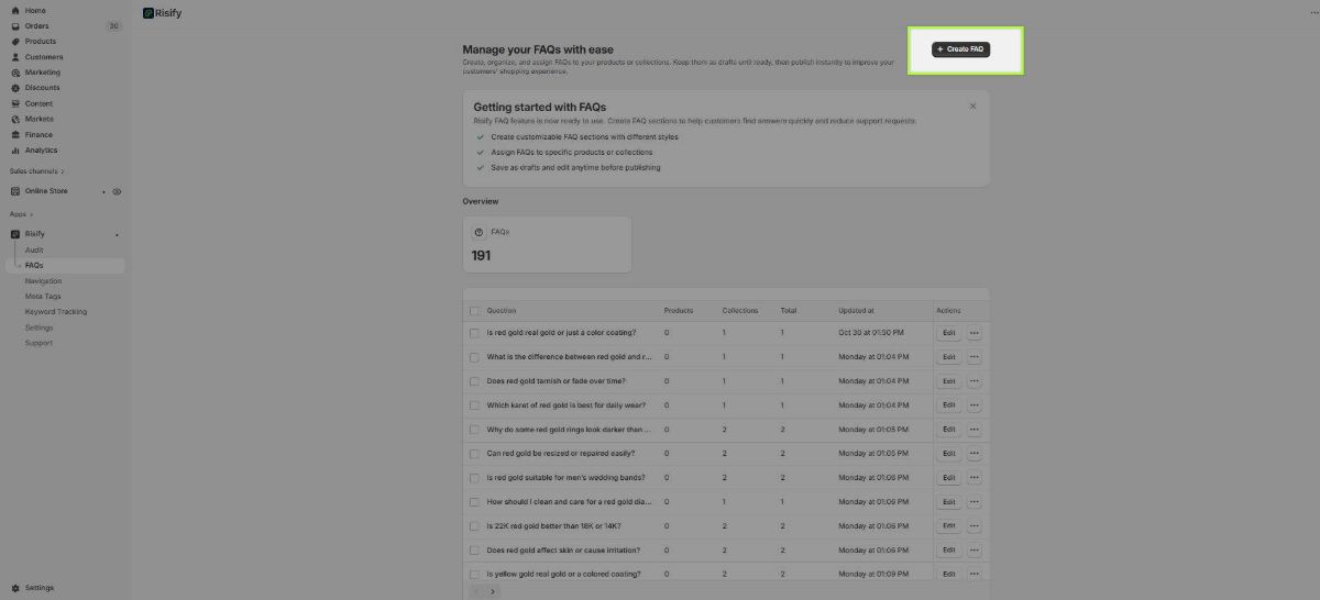This phase happens entirely inside your Shopify Admin panel under Apps → Risify → FAQs . Here you’ll prepare all the content that will later appear on your store.