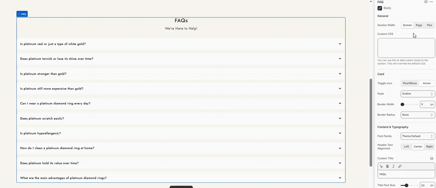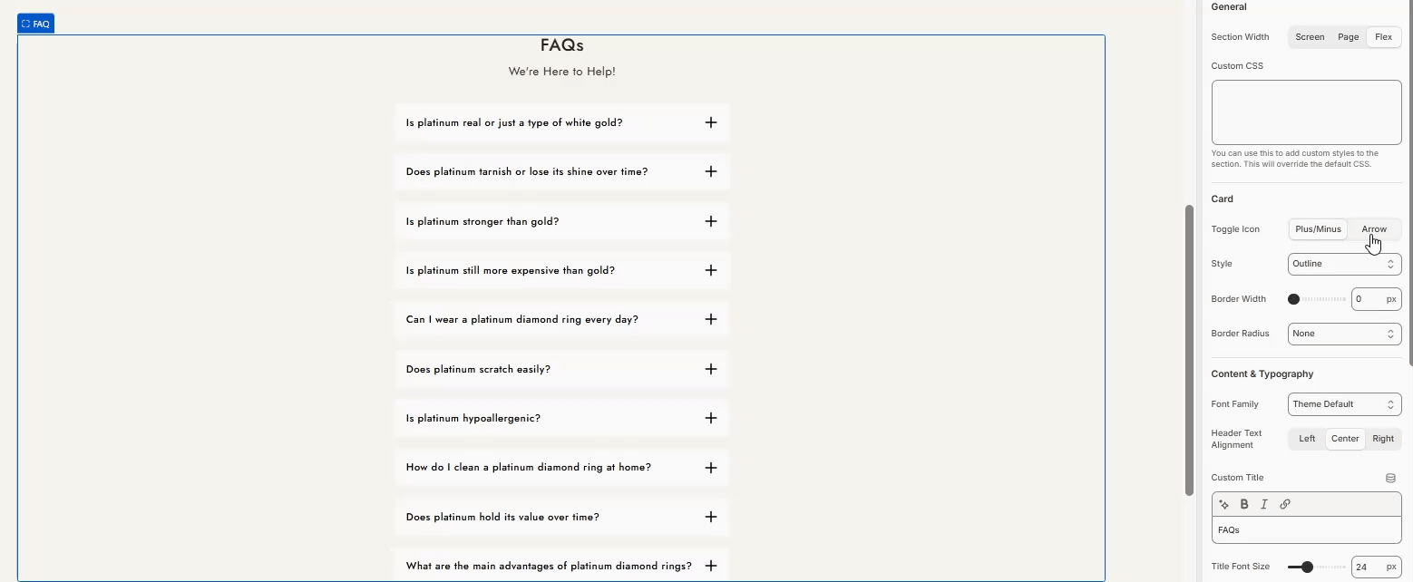 - Section Width - Choose whether the FAQ matches your theme’s content width, spans the entire screen, or adapts to its container layout.