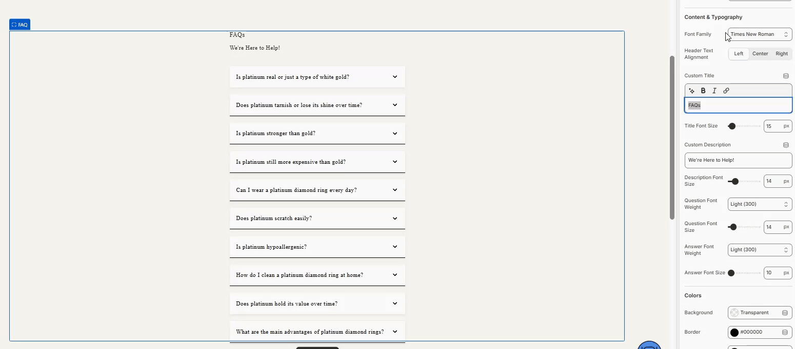 - Title Text: Adjusts the color of the FAQ section’s main title.