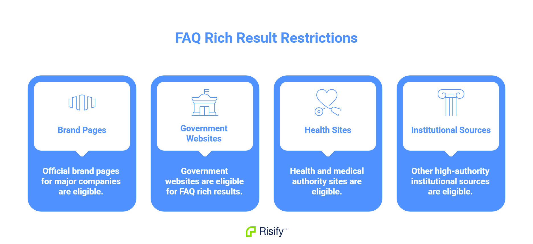 Google has significantly limited this feature. Starting in 2023 and continuing through 2024 and 2025, FAQ rich results have been restricted to narrow categories: