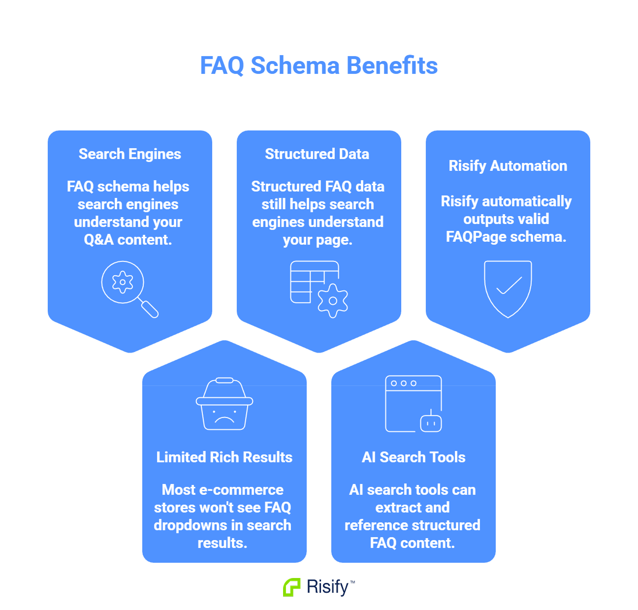 - Risify outputs valid FAQPage schema automatically when you assign FAQs to products or collections.