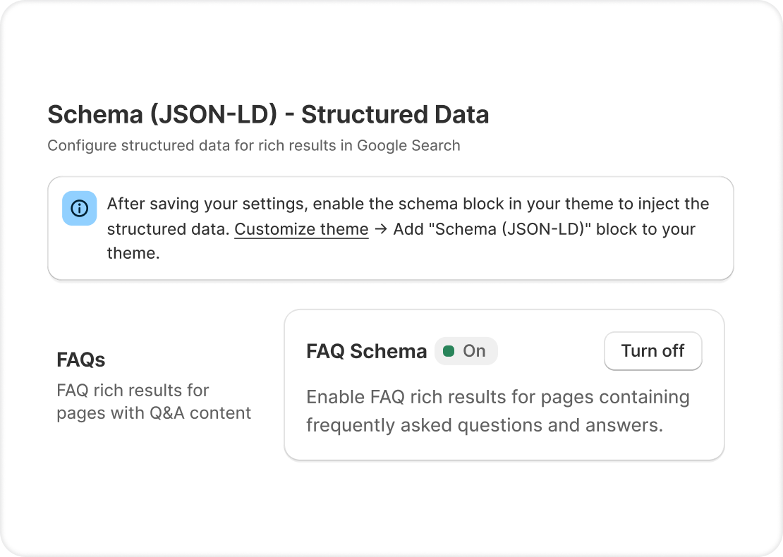Create FAQs, manage meta tags, and activate schema markup across your store with AI.