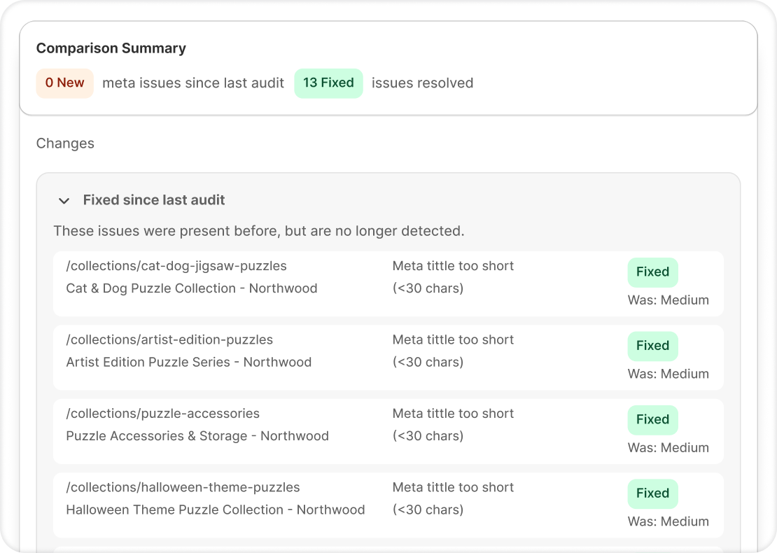 View and edit all product meta titles and descriptions in one dashboard. Fix gaps fast or generate optimized meta in bulk with AI.