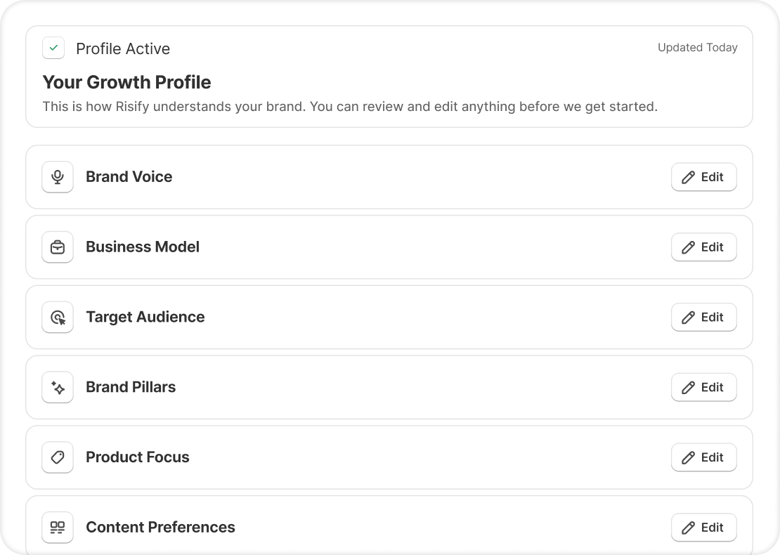Your Growth Profile isn't locked after setup. When you launch new products, shift your messaging, or change your audience focus, update the relevant sections and the AI adapts immediately.
