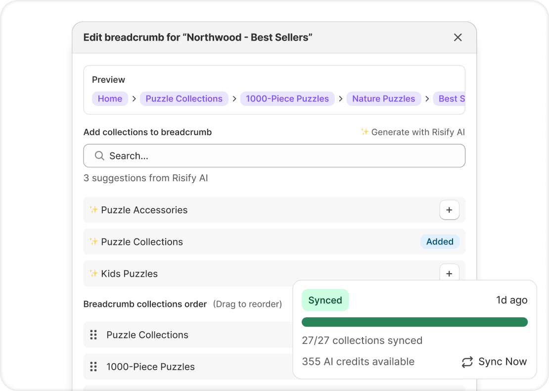 Risify AI analyzes your collections and suggests breadcrumb paths and related collection links.
