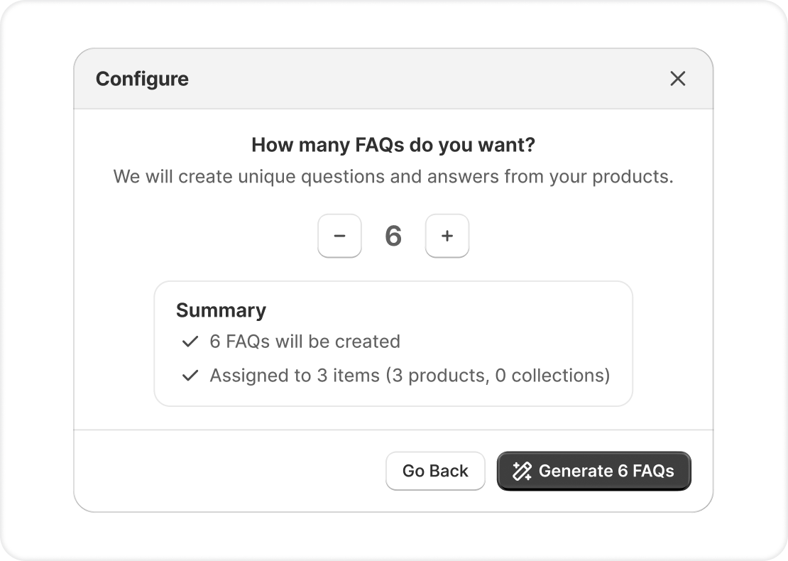 Select the products you need content for. The AI generates unique meta tags or FAQs for each one in a single batch.