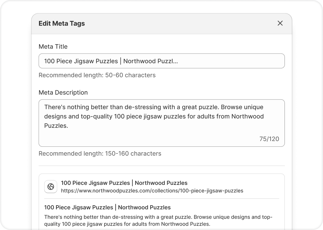 Meta tags are standard Shopify fields. Risify writes to them directly through Shopify's API. No external scripts involved, so your store speed stays the same.