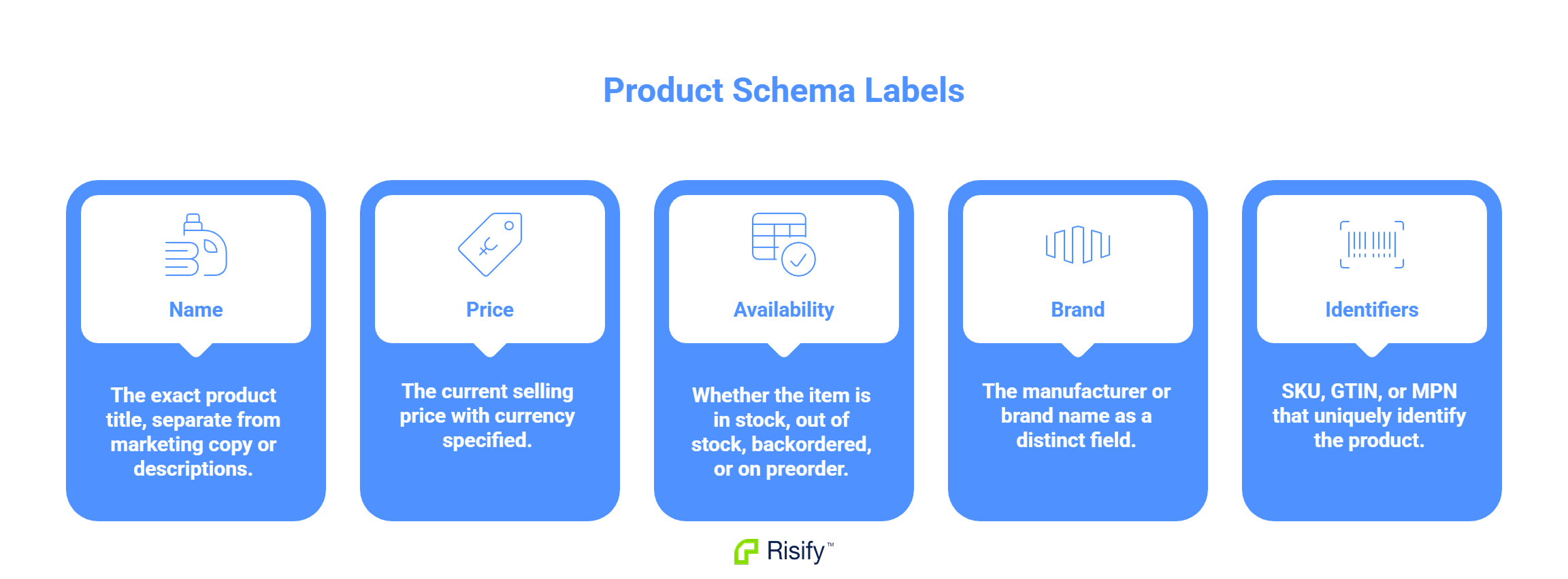 The meaning is stated directly. The AI tool does not need to figure out which number is the price or whether "available" means in stock or available for preorder. The schema tells it exactly what each piece of information represents.
