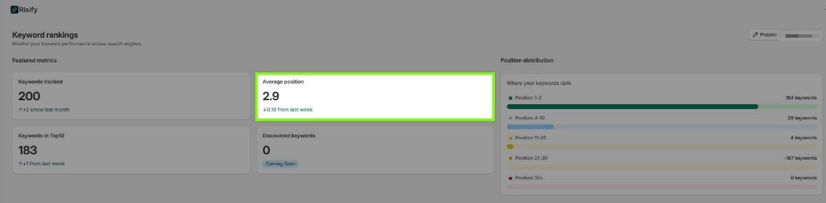 This shows the average search ranking of all keywords in your project. A lower number means better visibility.