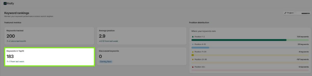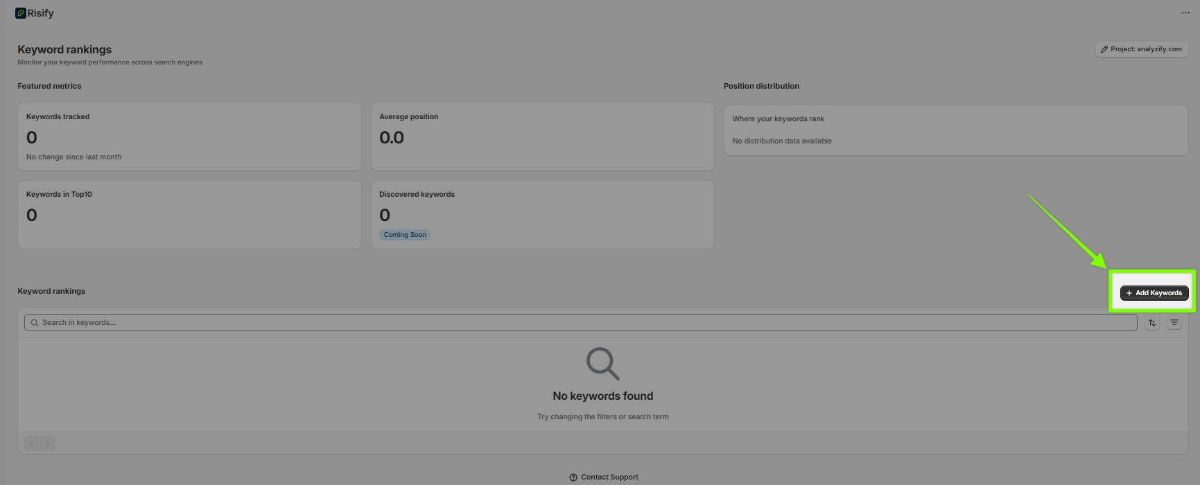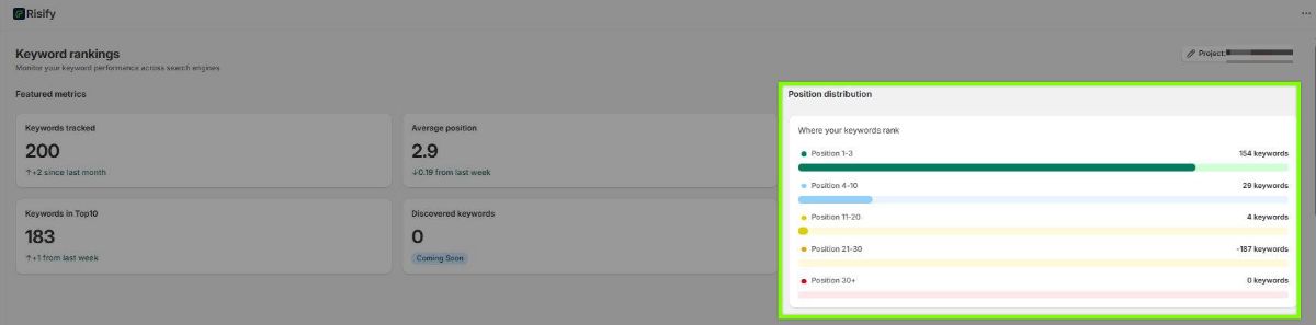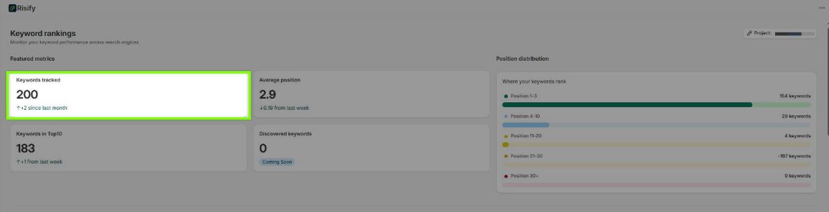 Setup takes only a few steps within Risify, and once your keywords are added, the dashboard updates automatically. This feature centralizes your SEO insights in one place so you can understand performance instantly without switching tools.