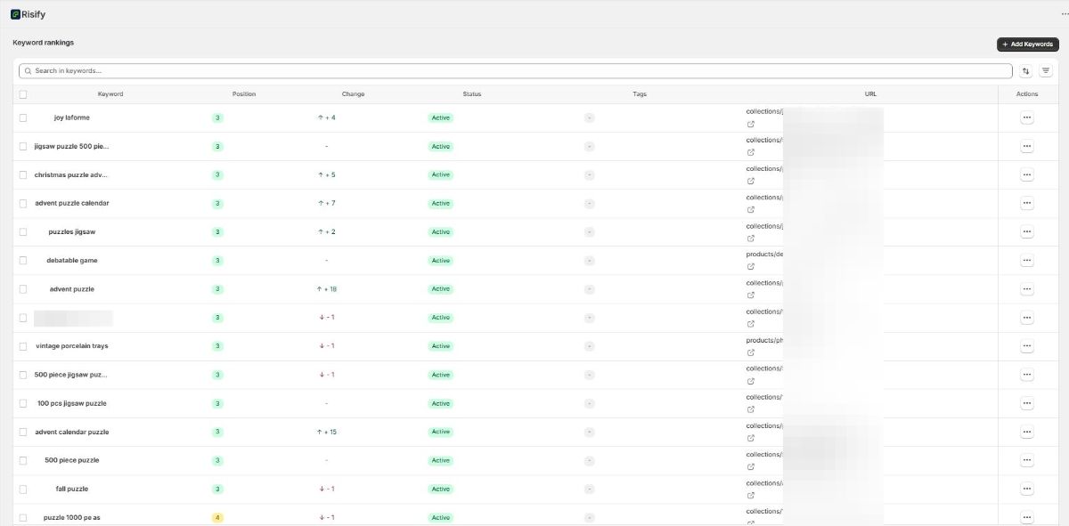 Risify Keyword Tracking helps you understand how your store performs on search engines without leaving your Shopify dashboard. Everything you need is collected in one place.
