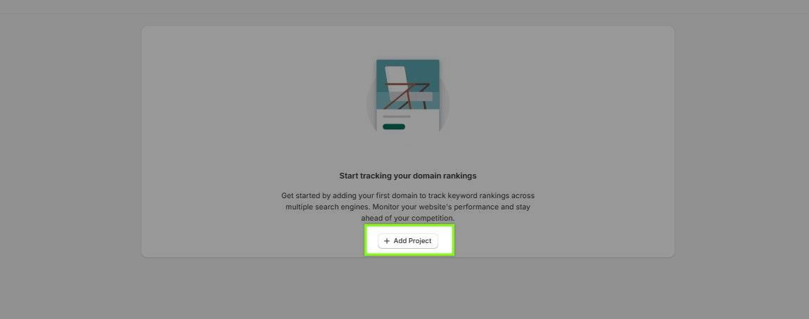 If this is your first time using the feature, you will not see a dashboard yet. Instead, you will see a screen that says “Start tracking your domain rankings” with an Add Project button.
