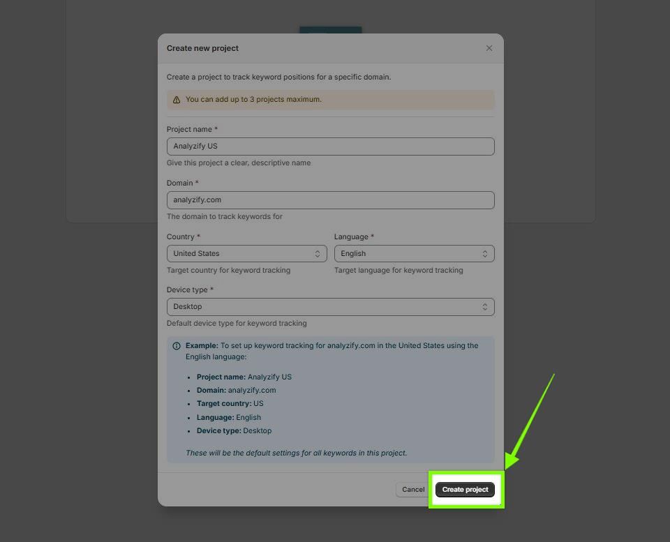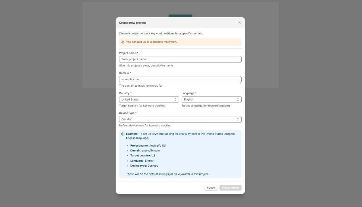 Example: myshop.com 3) Country and Language: Select the target market where you want Risify to check your rankings. 4) Device Type: Choose Desktop or Mobile. This will be the default device Risify uses for ranking checks.