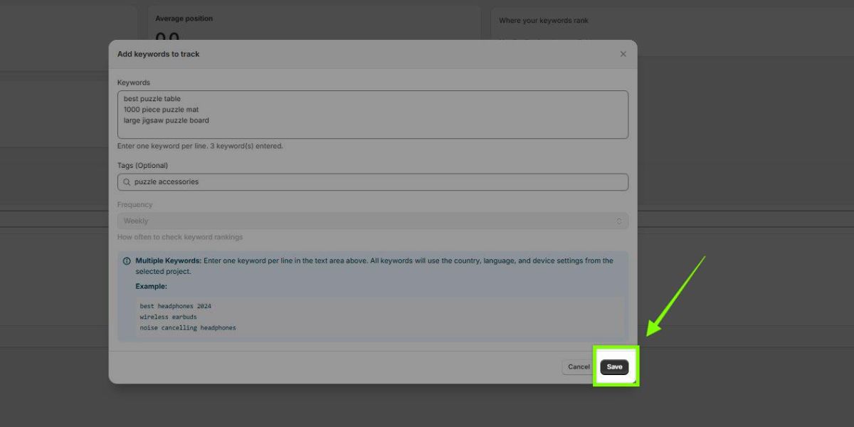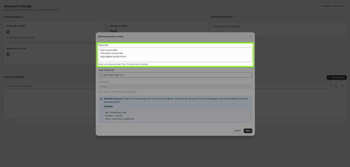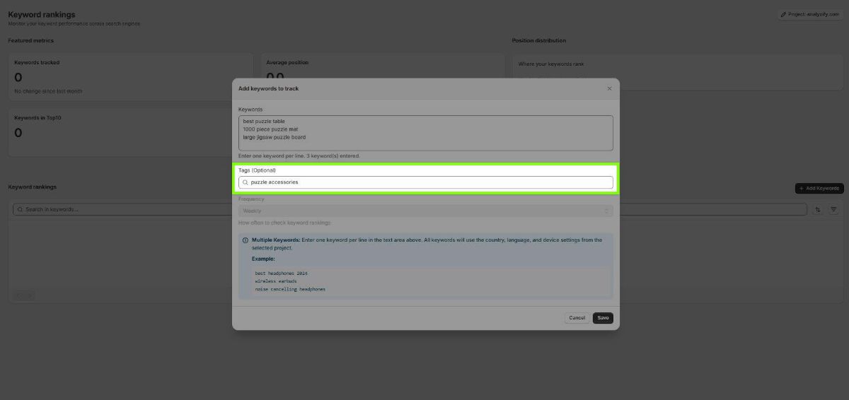 Tags help you organize your keywords by grouping them under meaningful labels. This is useful when you track many keywords and want to filter them easily.