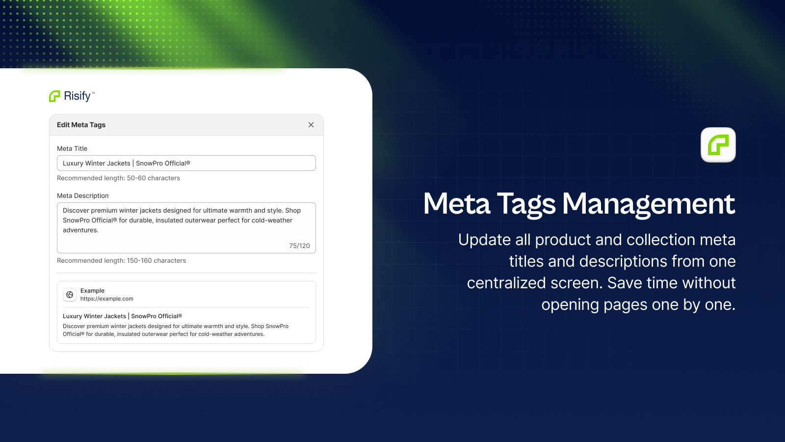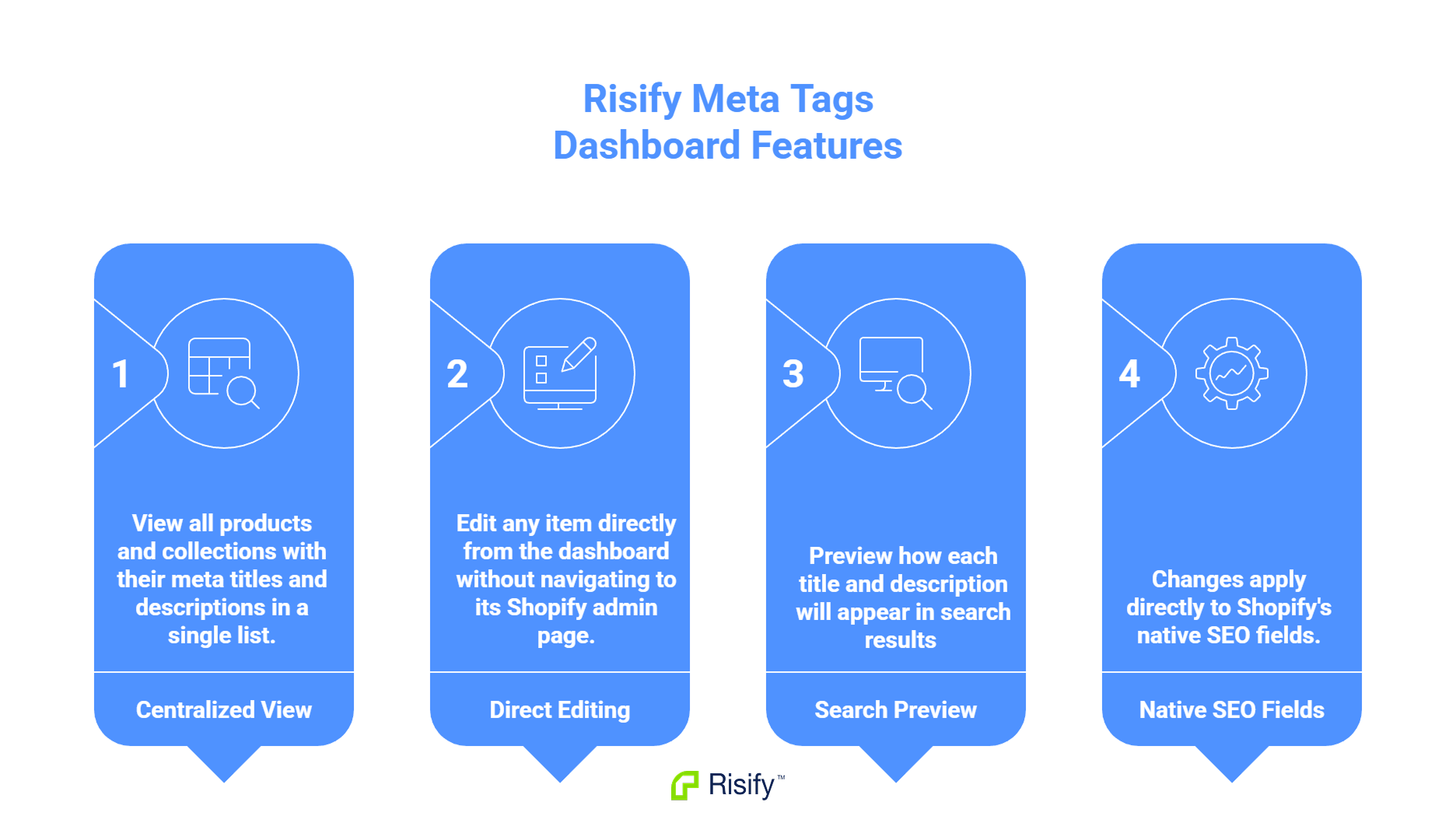 Risify's Meta Tags dashboard gives you visibility into your catalog's metadata without opening each product individually. You can identify gaps, fix inconsistencies, and maintain standards as your catalog grows.
