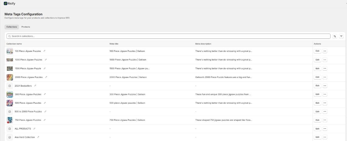 Risify's Meta Tags dashboard lists all your collections and products with their current meta titles and descriptions visible in a single view.