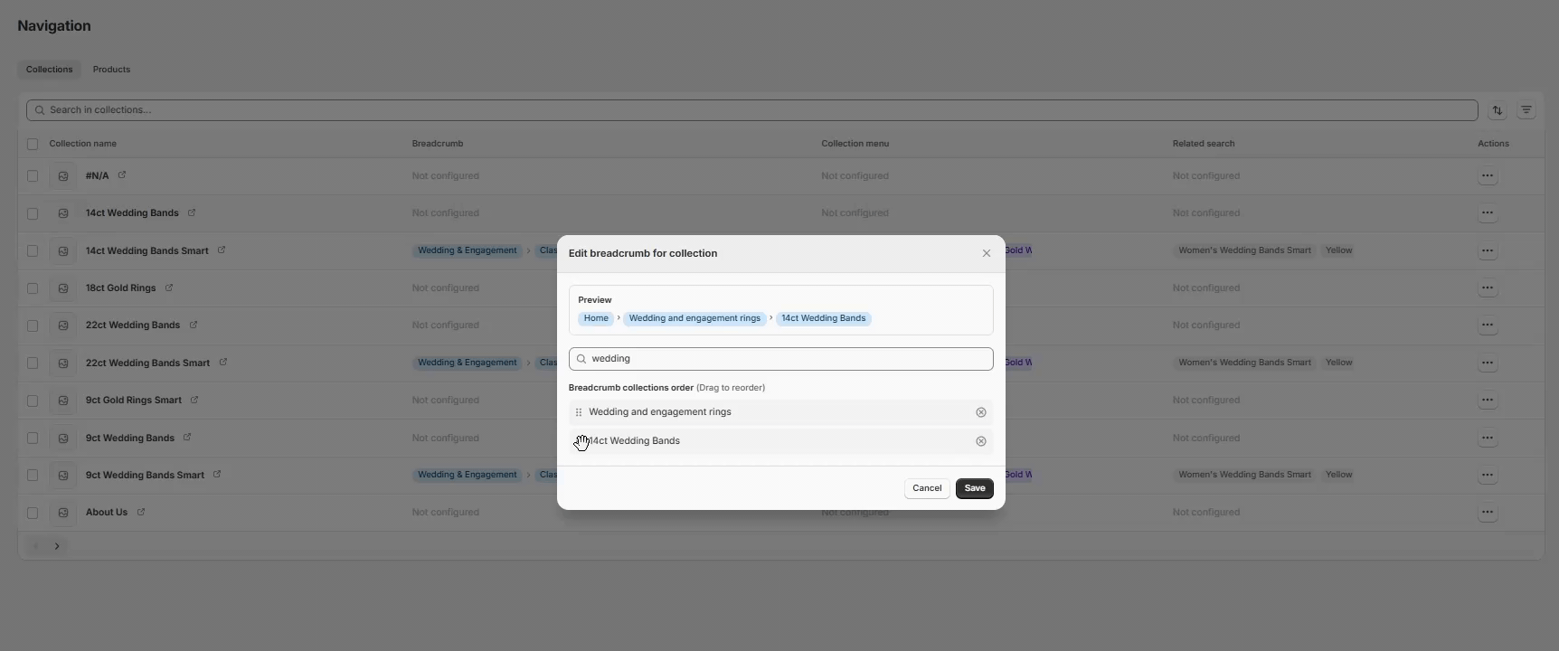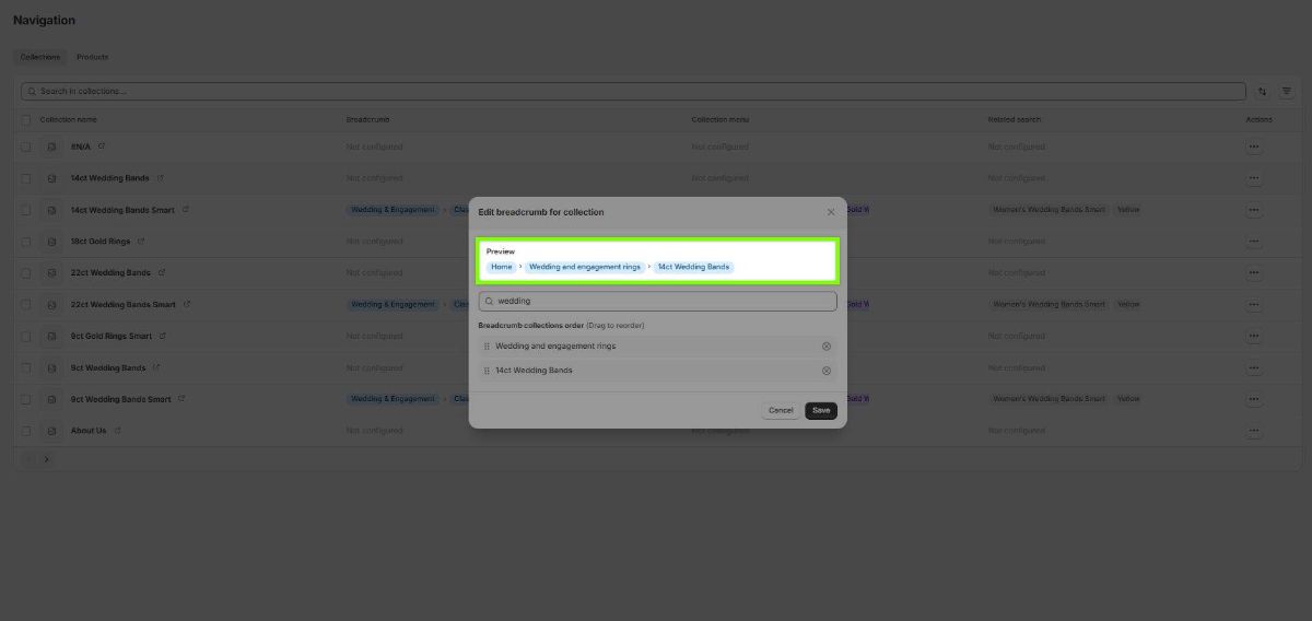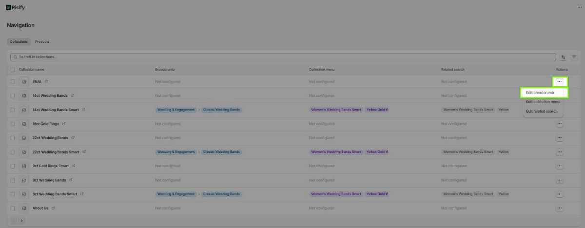 3) Find the collection or product you want to edit. In the Actions column, click the three dots (⋯) and select Edit breadcrumb.
