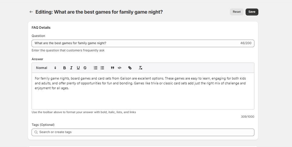 Most FAQ solutions work at the page level. You open a product page, add an FAQ section, and write questions and answers for that specific page. Then you move to the next product and repeat the process - either rewriting the same content or copy-pasting from the previous page.