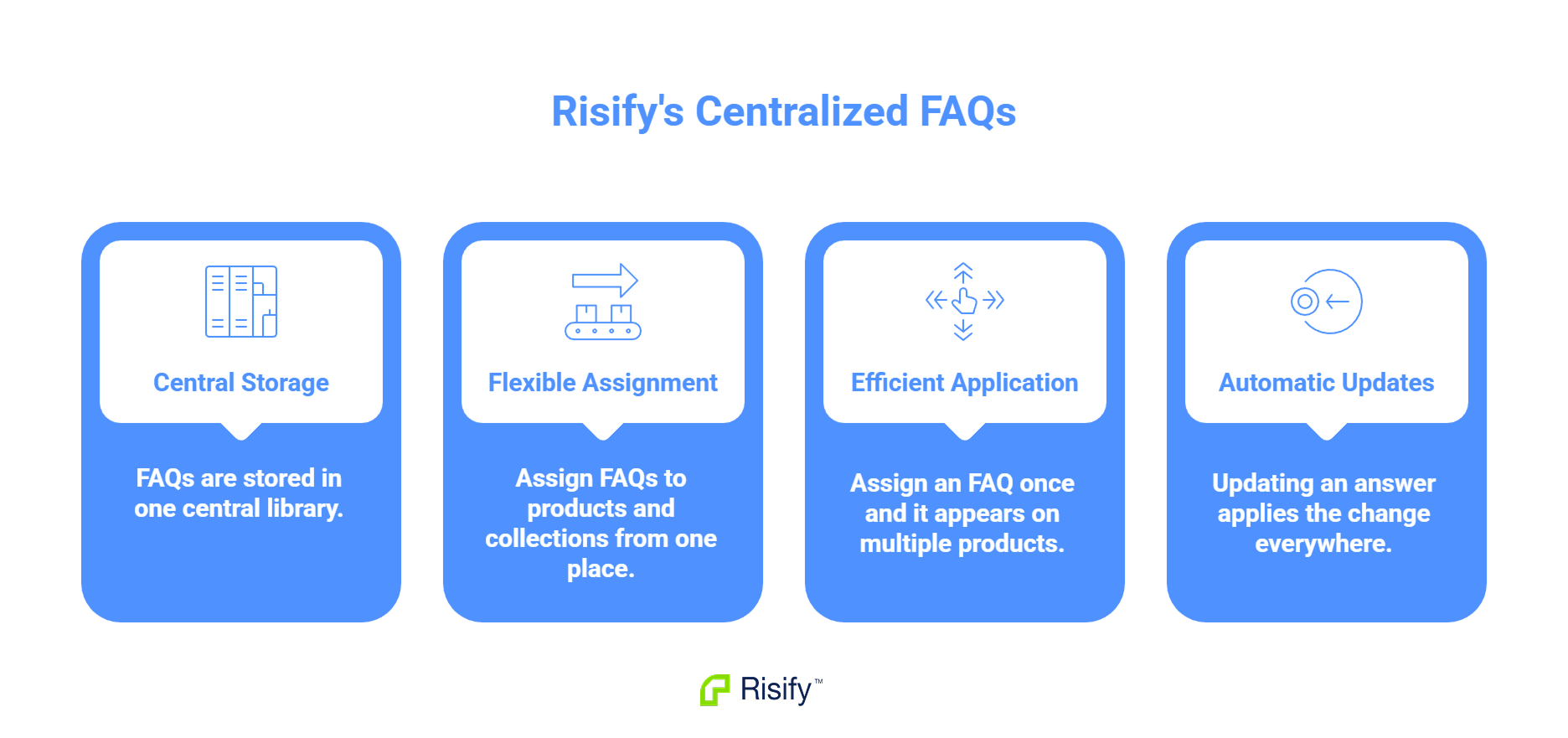 Risify's central library lets you create each FAQ once, assign it wherever it belongs, and update it everywhere with a single edit. Your answers stay consistent, your workflow stays efficient, and your FAQ content stays under control.