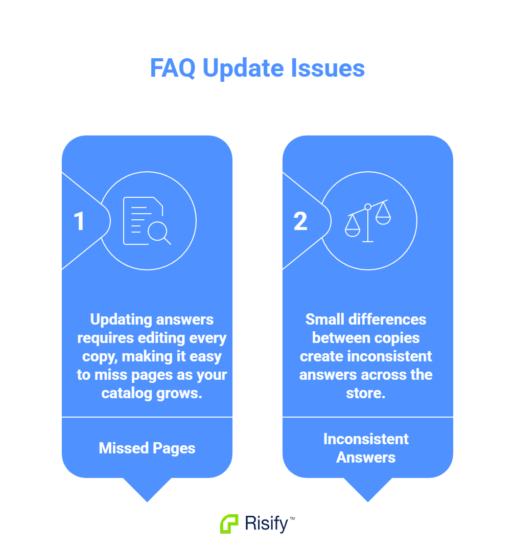 When an answer changes, you need to find and edit every instance. If your return window extends from 30 days to 60 days, you hunt through product pages updating each copy. Miss one, and customers see conflicting information depending on which page they visit.