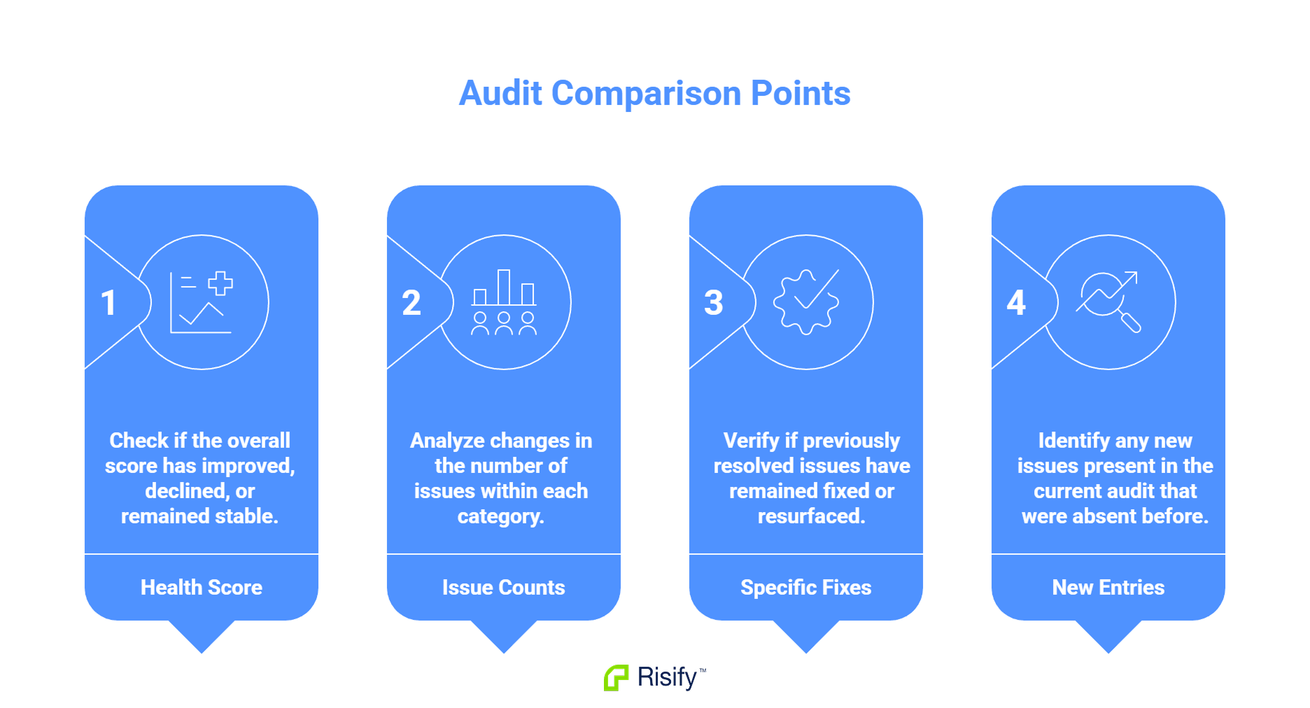 - New entries: Are there issues in the current audit that did not exist in previous scans?