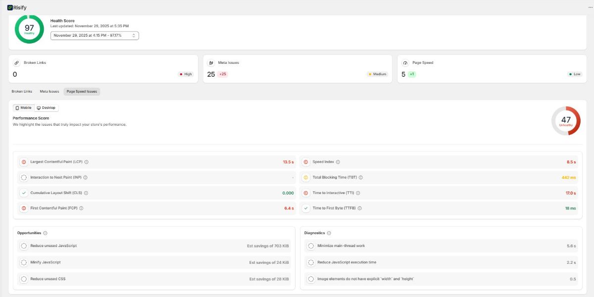 Risify runs automated weekly audits and saves the results, turning your store audit into an ongoing monitoring system rather than a one-time check.