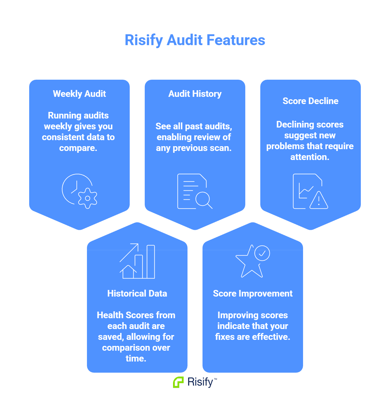 A single audit shows current state. Weekly audits show trajectory. By comparing Health Scores over time, you can confirm that your fixes are working and catch new issues before they accumulate.