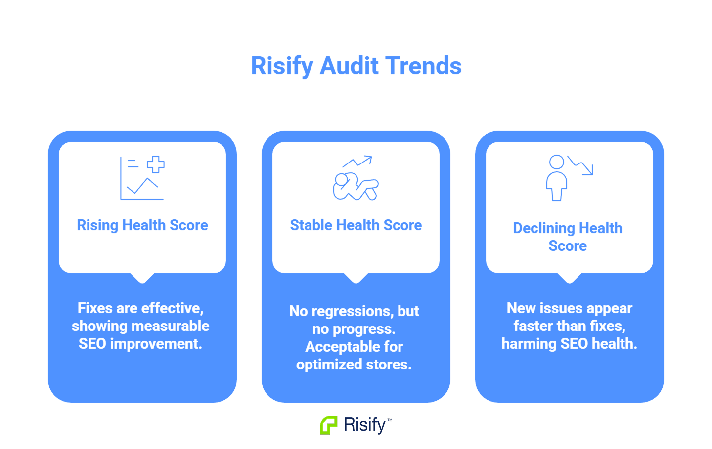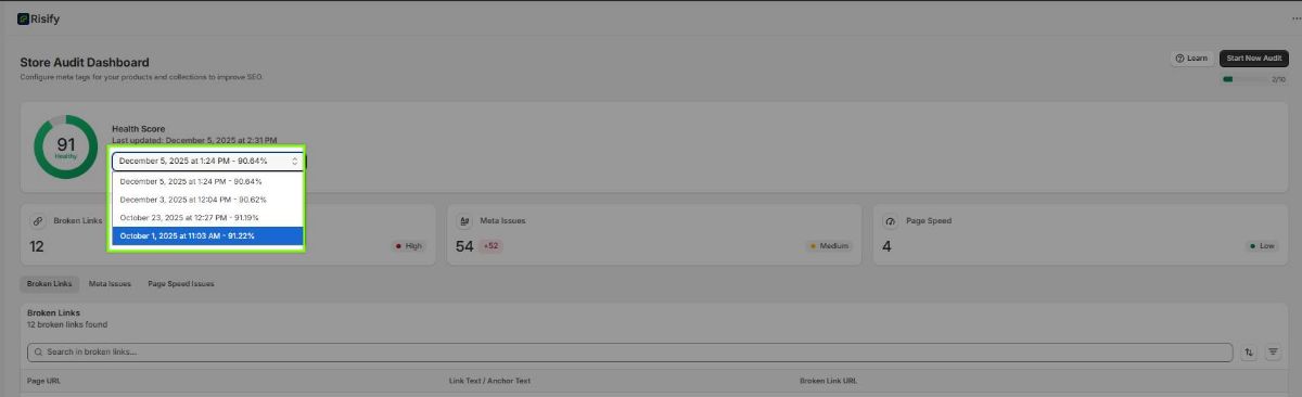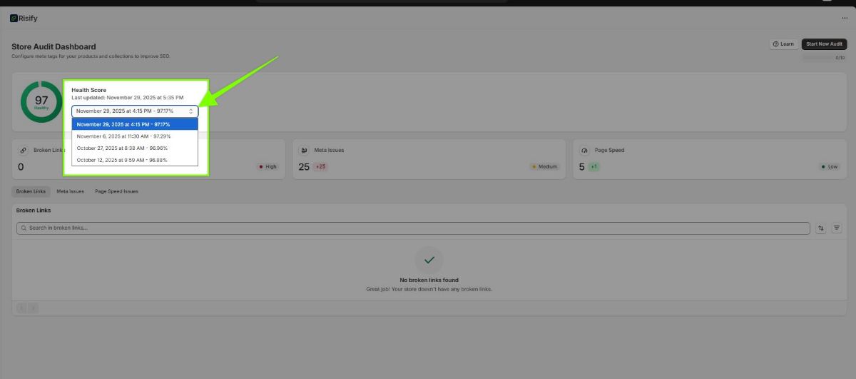 Risify saves the results of each audit automatically. You can access any past audit to see what your store's SEO health looked like at that point in time.