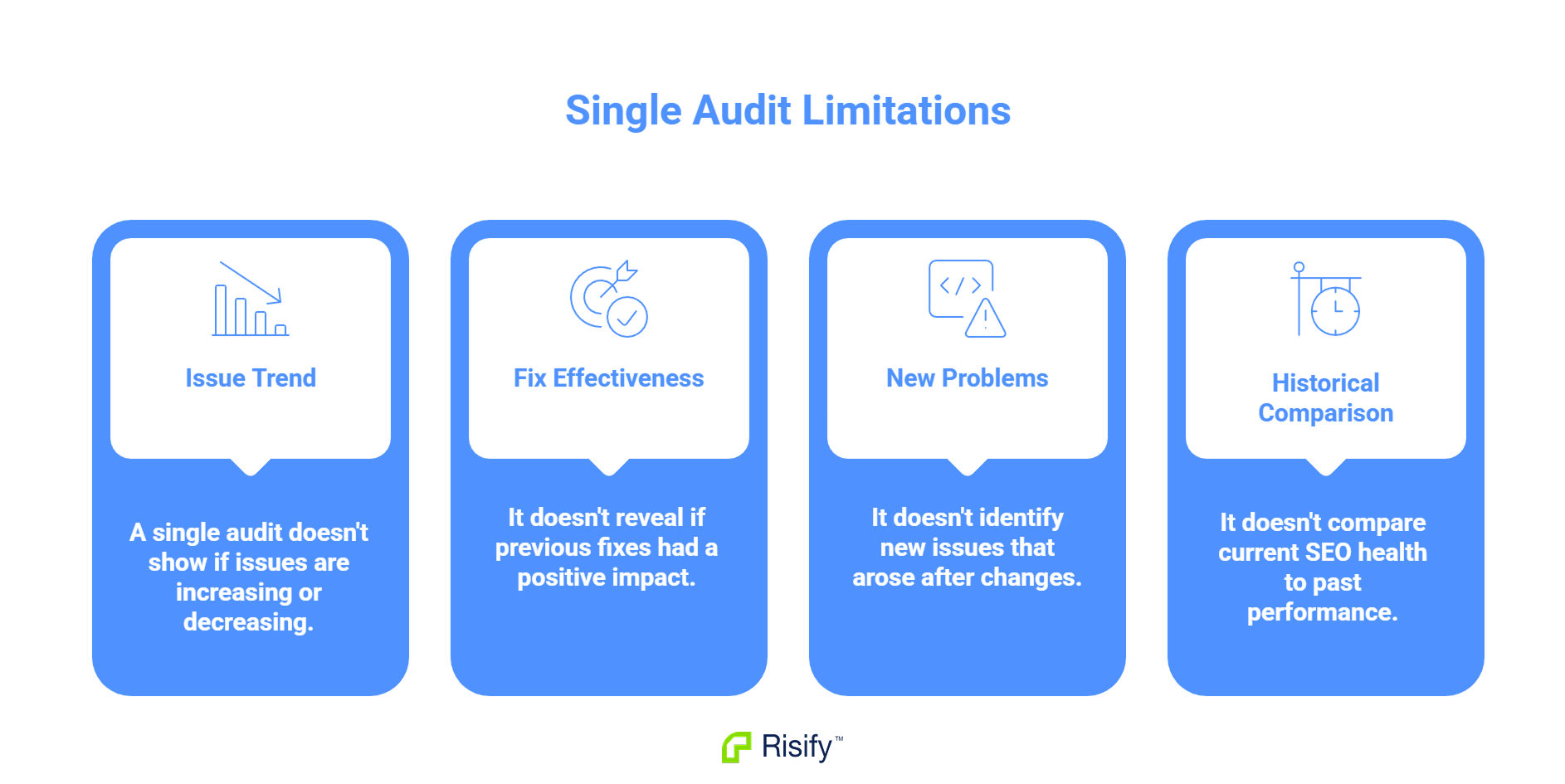 A single audit is a snapshot. It tells you how many broken links exist today, what metadata is missing today, and how fast your pages load today. That information is useful for creating a to-do list of things to fix.