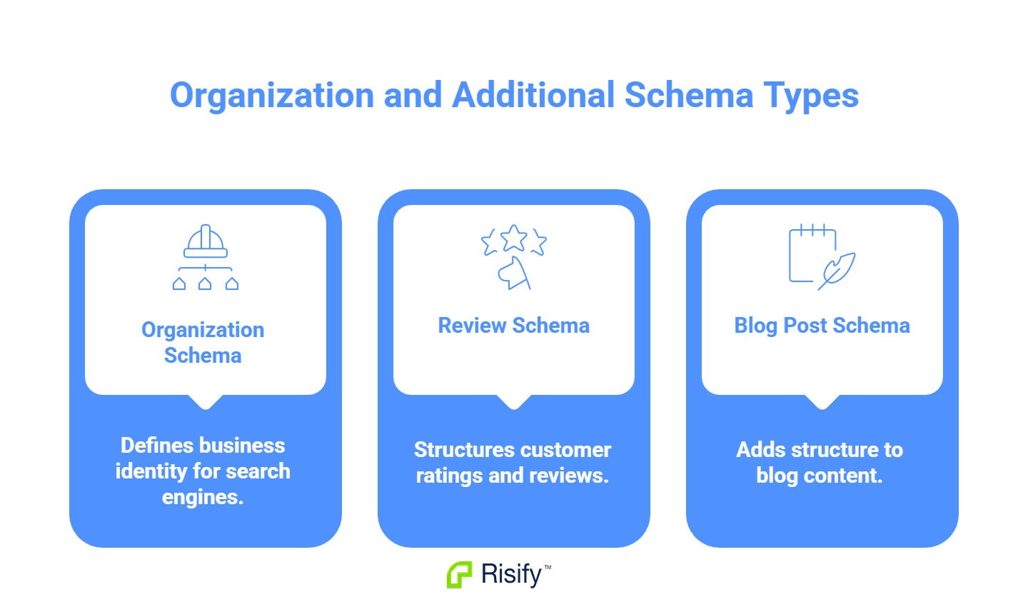- Risify implements Product, Organization, Breadcrumb, Review, FAQ, and Blog Post schema.