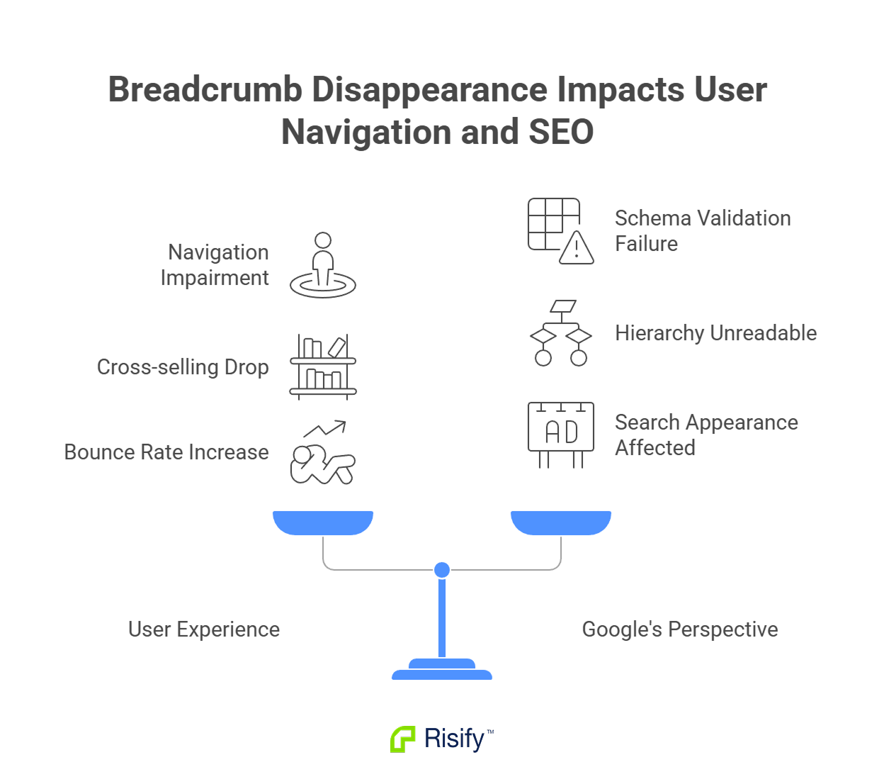 - Missing breadcrumbs break both user navigation and BreadcrumbList schema validation.