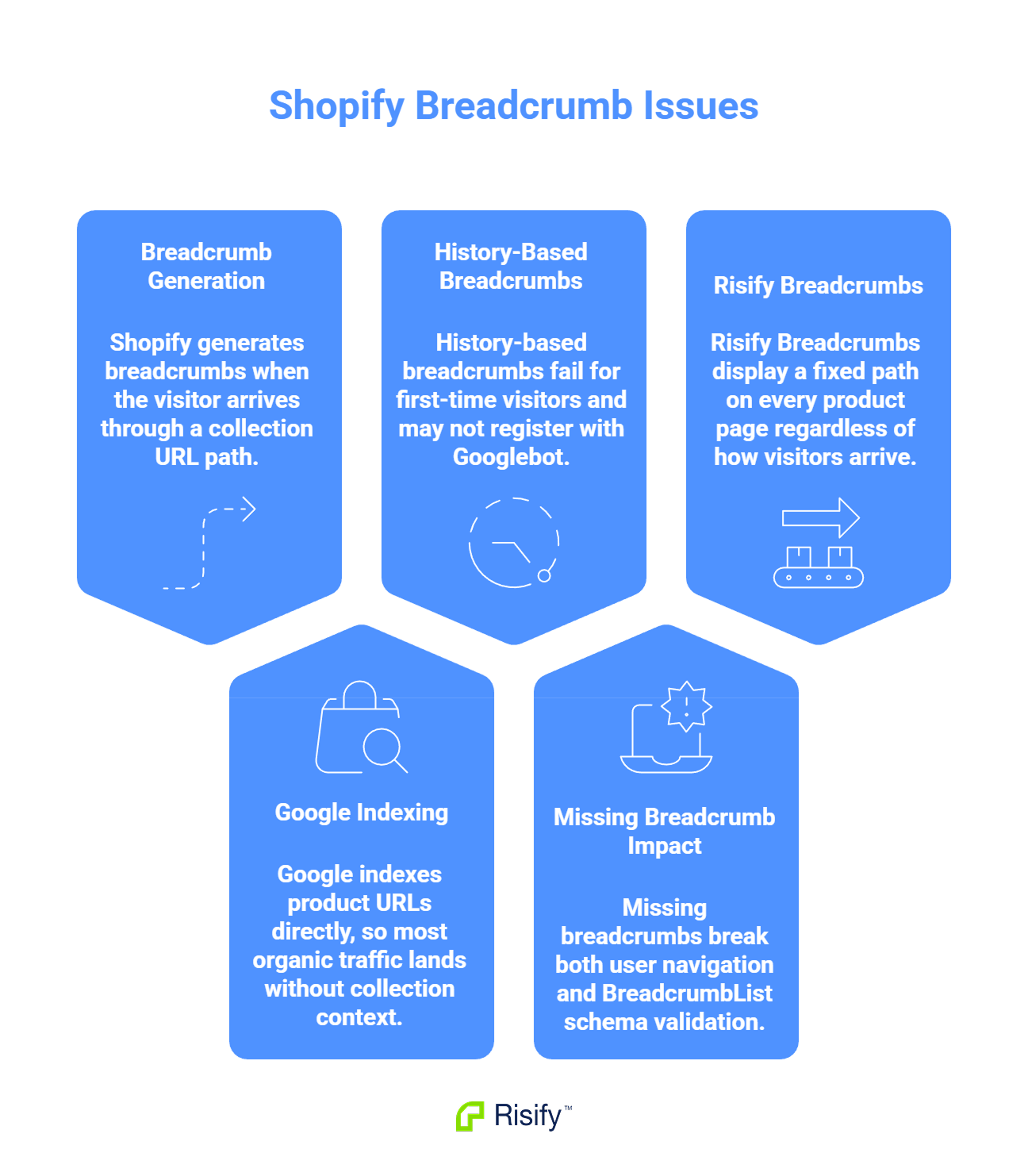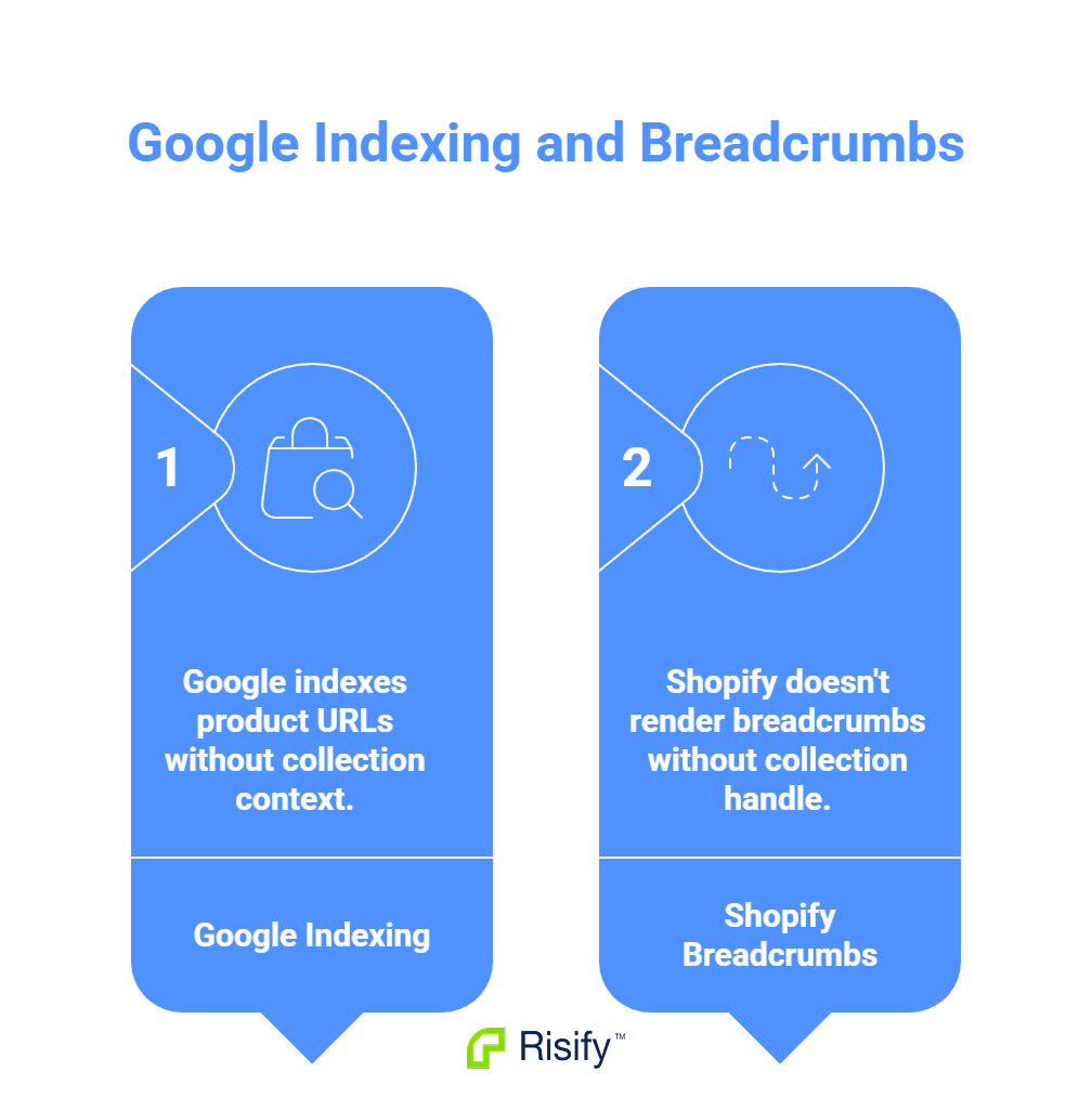 Risify Breadcrumbs solve this by displaying a fixed navigation path on every product and collection page, with valid schema that Google can index.