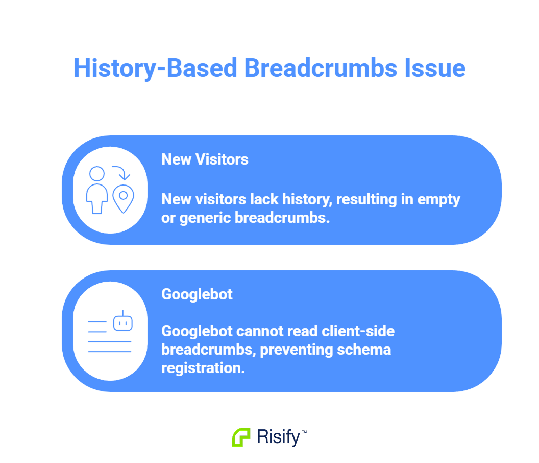 - History-based breadcrumbs fail for first-time visitors and may not register with Googlebot.
